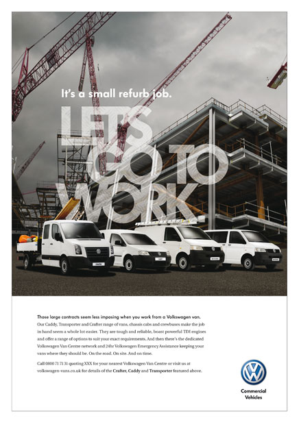 Volkswagen Commercial Vehicles used to be marketed in a similar way to its sister car brand - as a premium vehicle. As the recession kicked in, a more direct, fit for purpose campaign was needed and 'Let's go to work' was born.